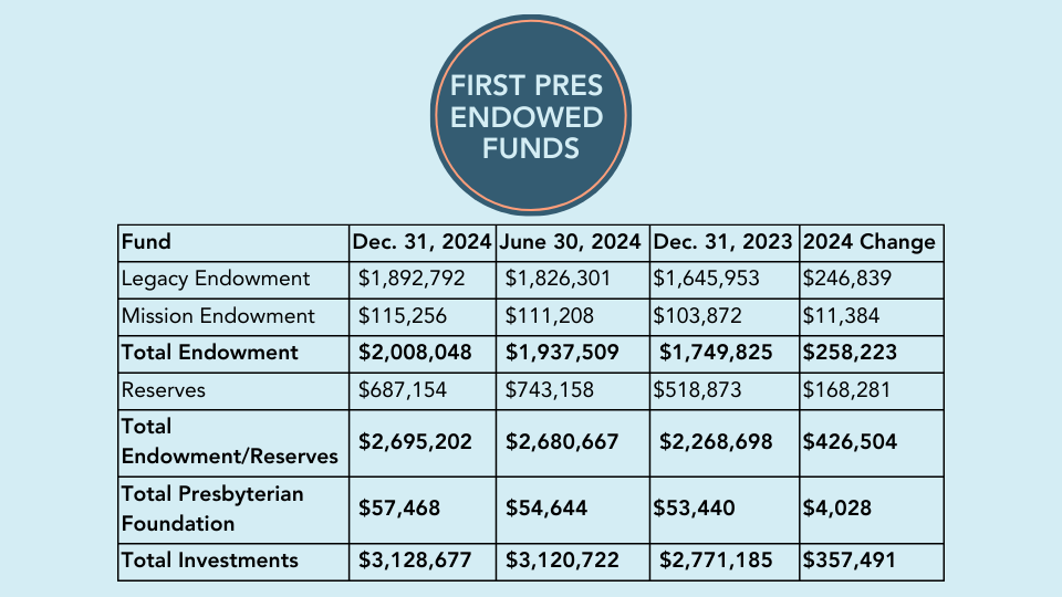 First Pres maintains reserve funds in the form of cash on hand to be used for emergency budgetary purposes when expenses exceed income and for unforeseen major expenses. For the most part, these funds are held in our endowment earning interest which is returned the reserve funds. Include here is the latest Investments Report.
